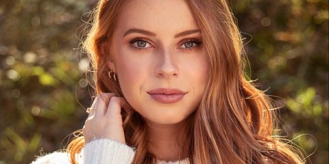 Positioning your light source closer to a scrim will provide a more specular look to your lighting. This is because you will have more of a hot spot in the center of your scrim and the light will spread quickly from the point of the hot spot. As you can see in Ashley’s comparison photos, there is a contrast in the highlights and shadows on the model’s face. The background is not as evenly lit and has a slight vignette to it.