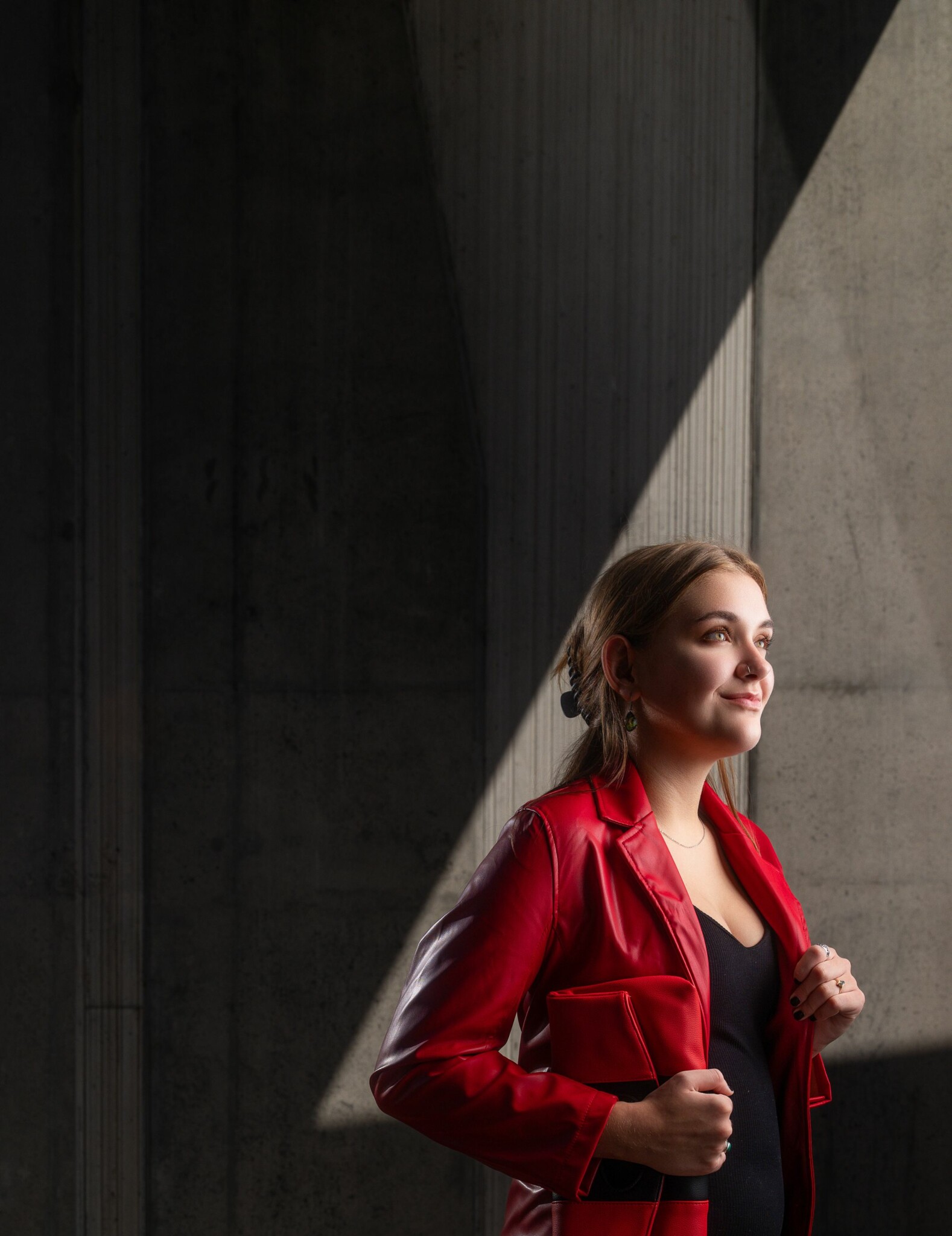 The barn doors focus the light precisely on Will’s subject, while a rim light adds depth to the background shadows. To balance the image, Will uses a 40-inch white reflector to soften shadows around Kaylee’s jacket and face, subtly brightening those areas for a more polished result. Reflectors are a simple yet powerful tool for manipulating light without adding another light source.