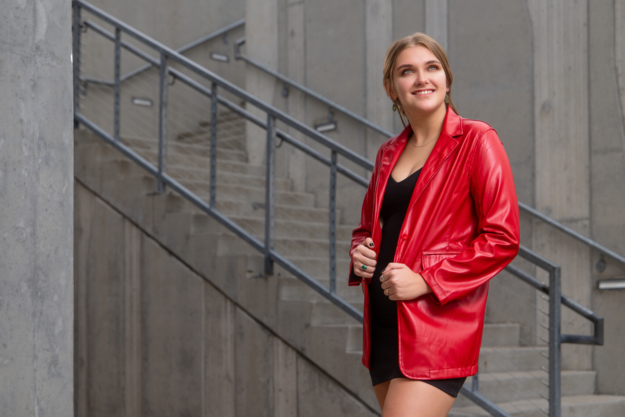 For the second setup, Will moves his subject, Kaylee, to a different location—a set of stairs where she leans against a railing. The goal for this shot is to focus the light on Kaylee’s face while minimizing light on the railing, creating a dramatic contrast in the image.